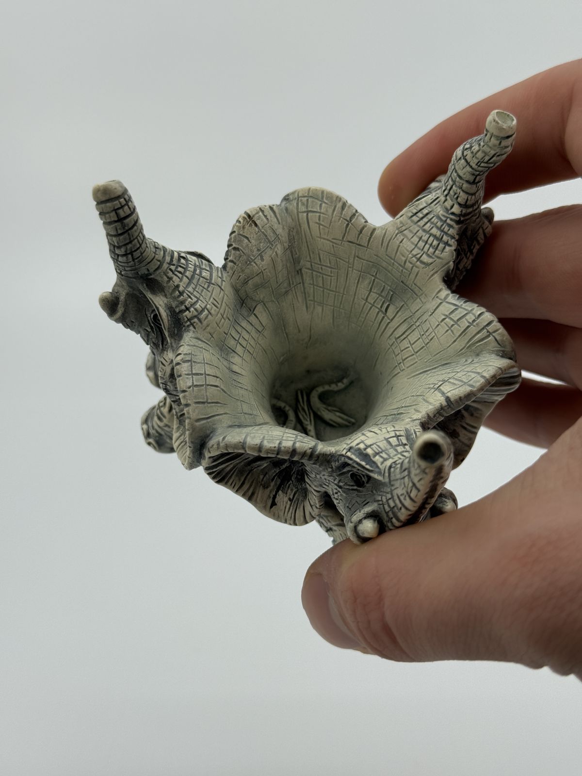 Miniatuurne dekoratiivne ese, mida ümbritsevad detailirohked elevandipead tõstetud londiga. Keskel on väike õõnes süvend, mis sobib pisiesemete, nt rõngaste hoidmiseks või teeküünla aluseks.