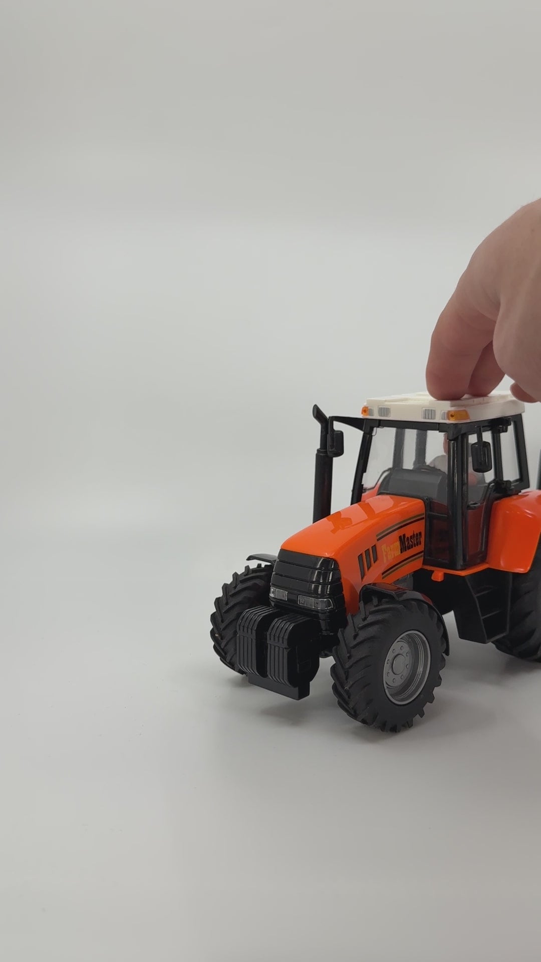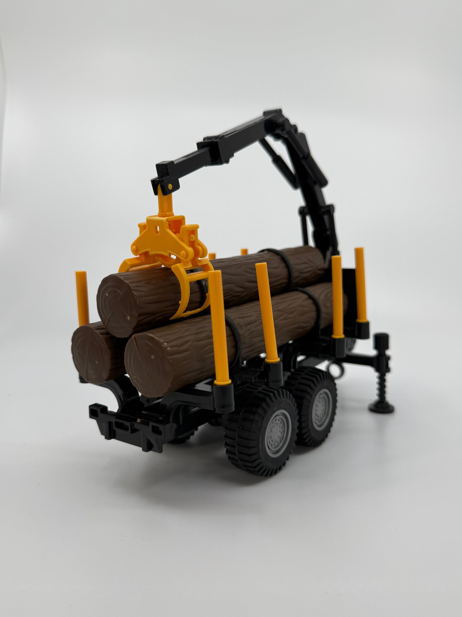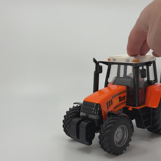 Oranž Farm Master mängutraktor koos haagise ja kraanaga, mis tõstab palke. Detailne ja vastupidav mudel.
