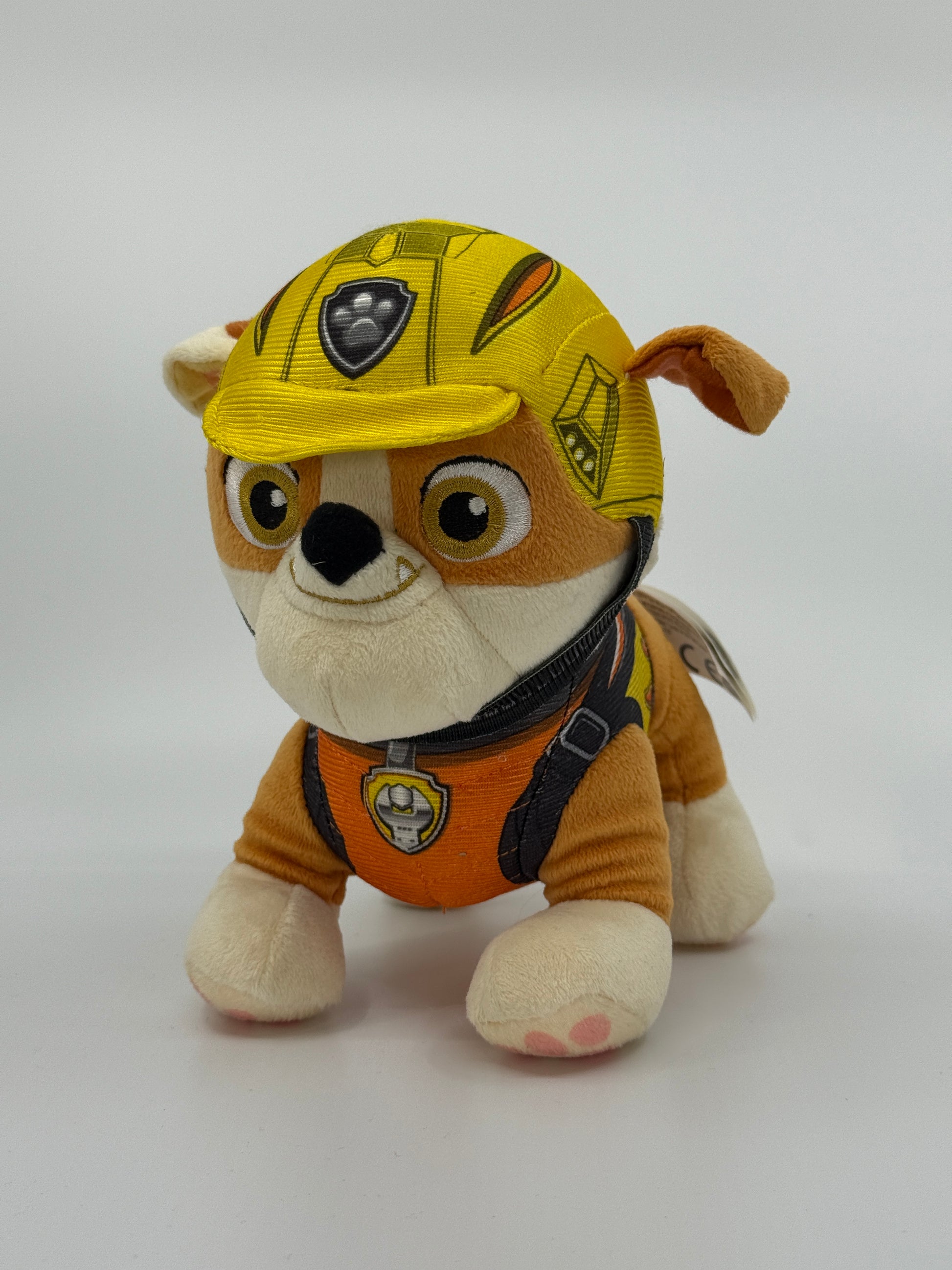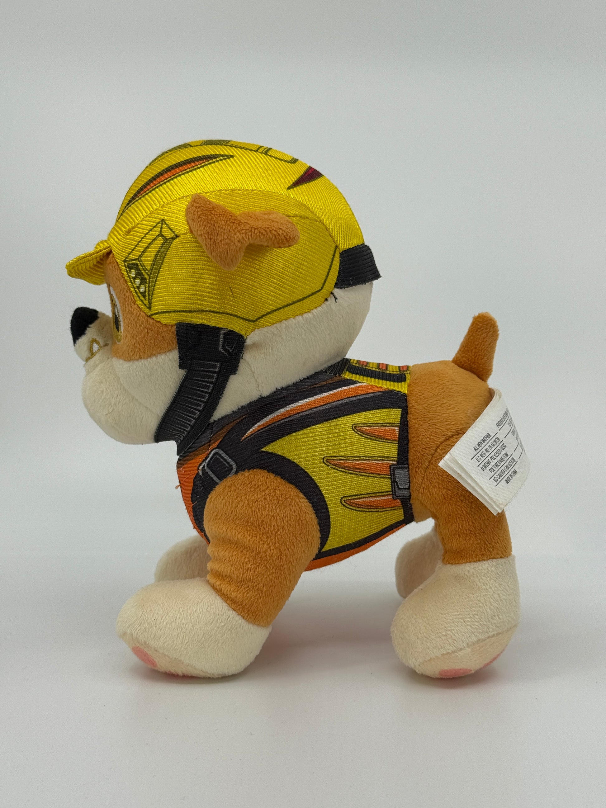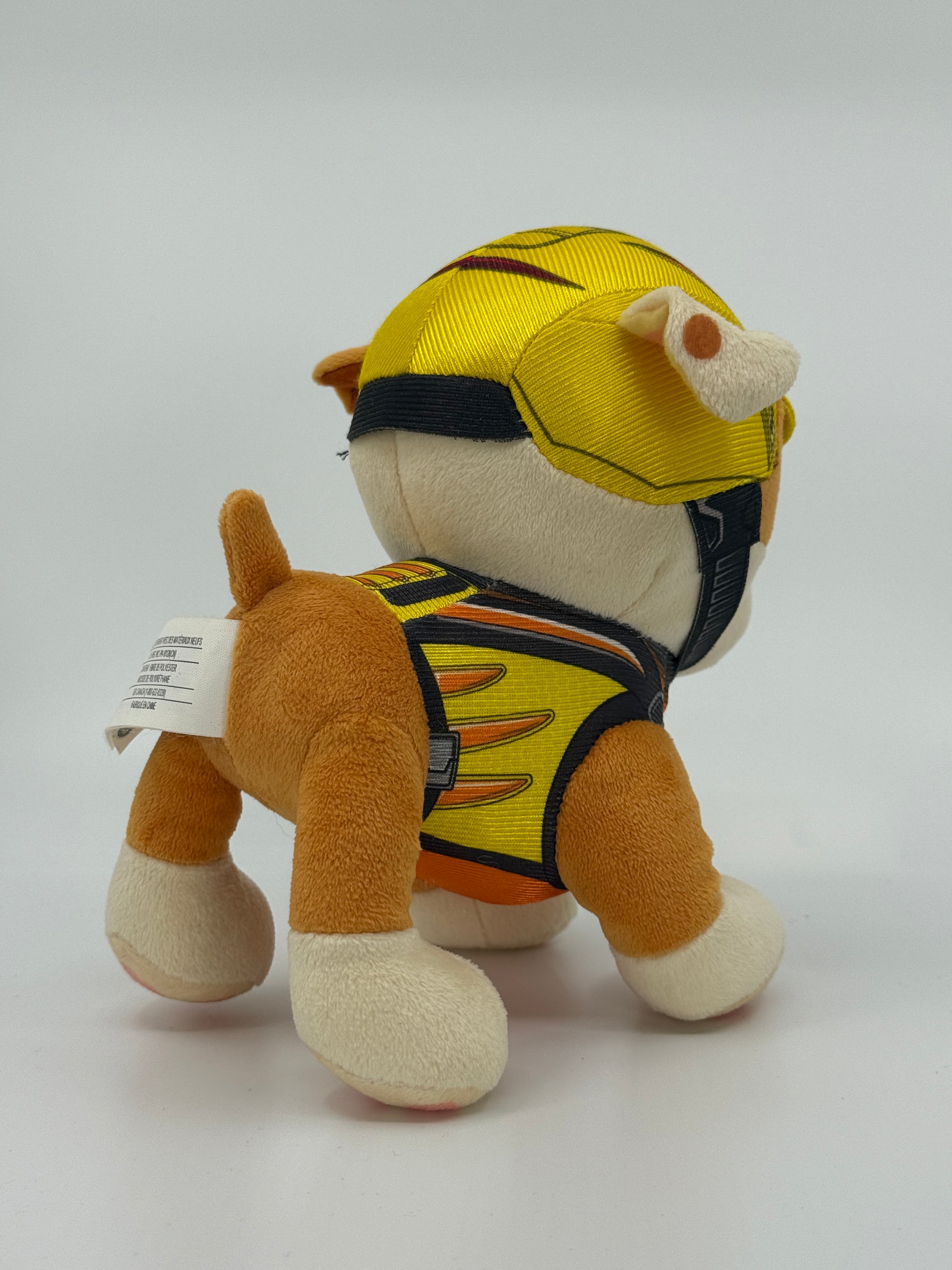 Armas pehme päästekoer kollase kiivri ja oranži vestiga. Sobib hästi kaisukaks või mängukaaslaseks.