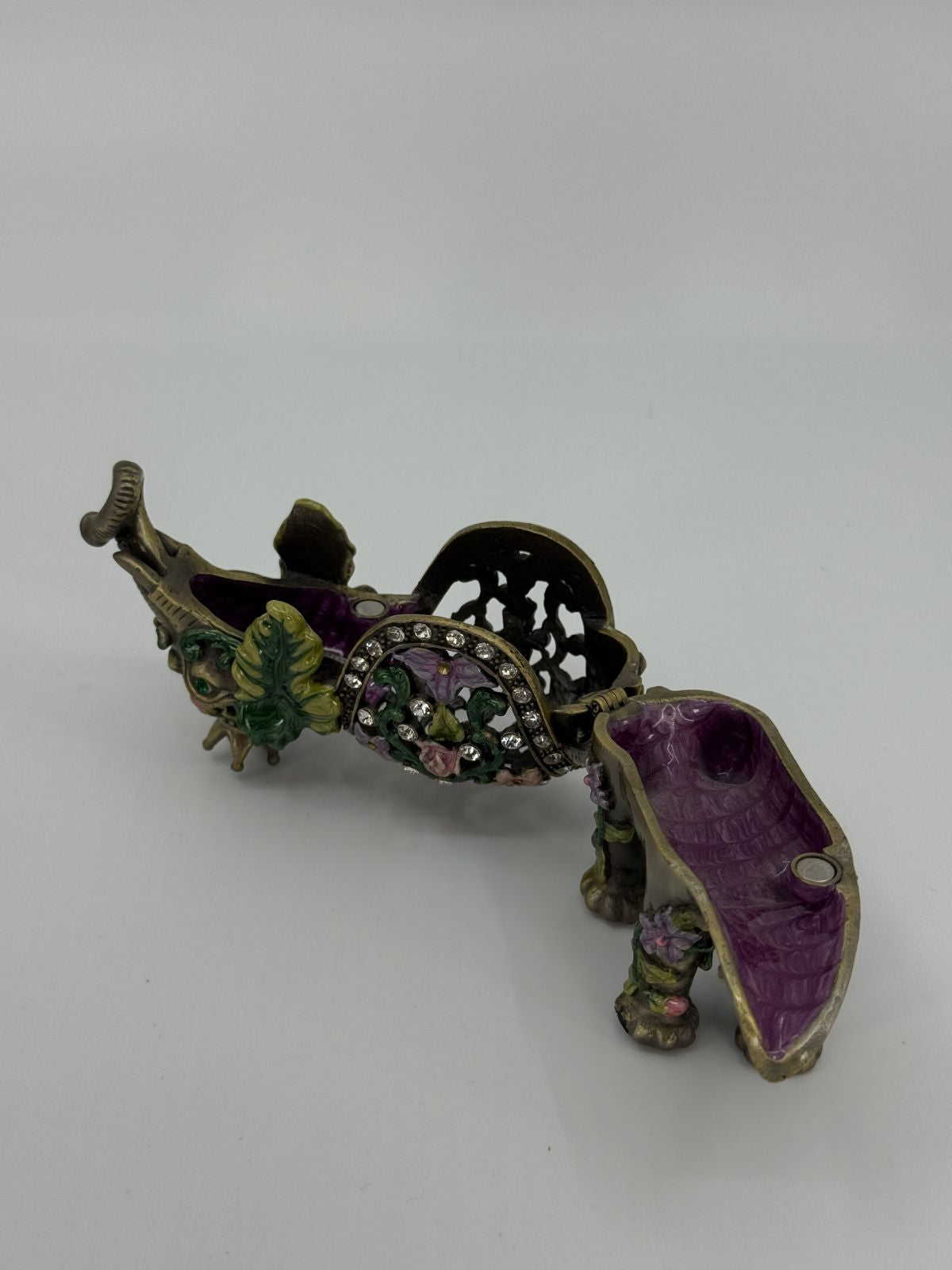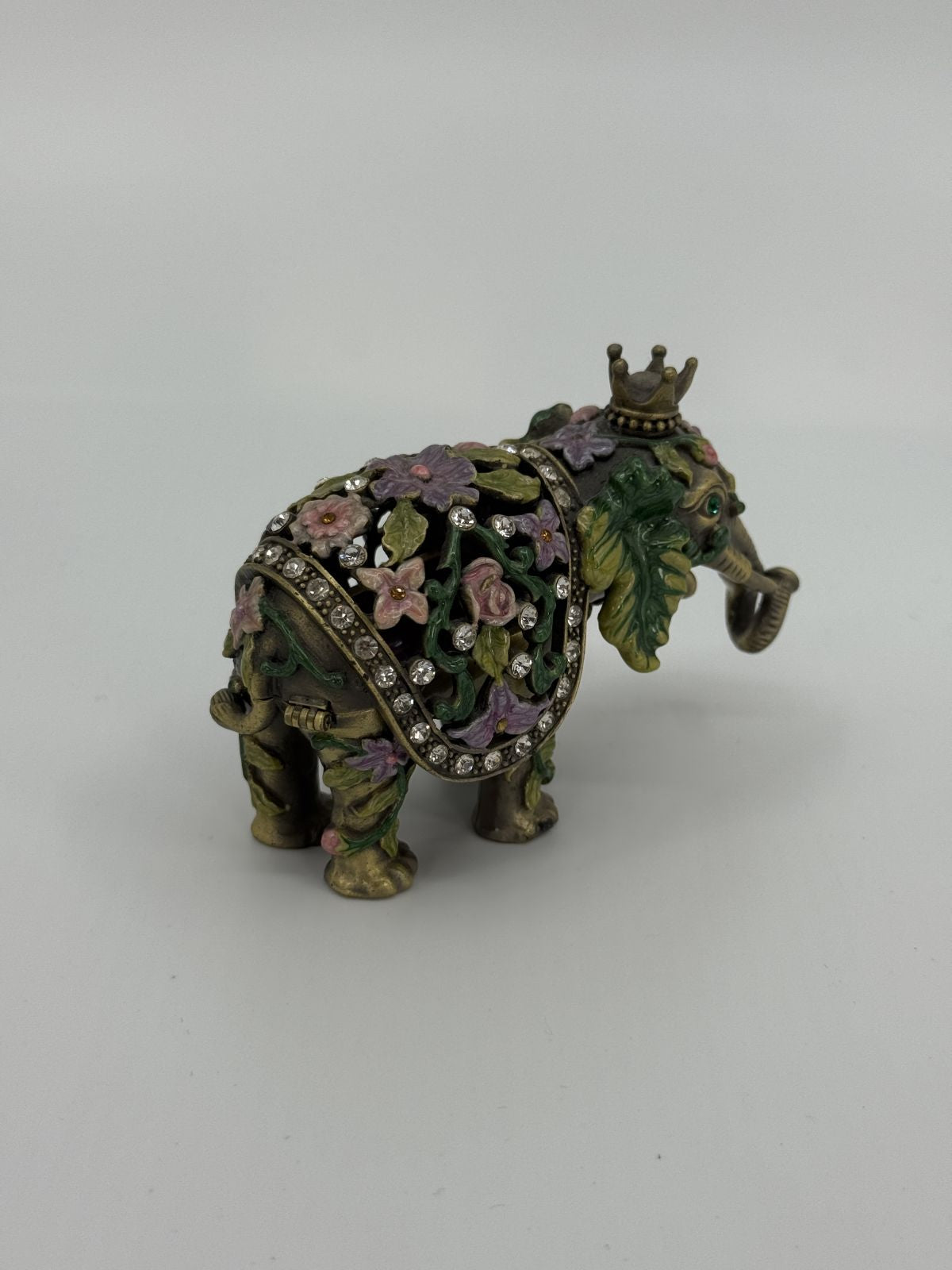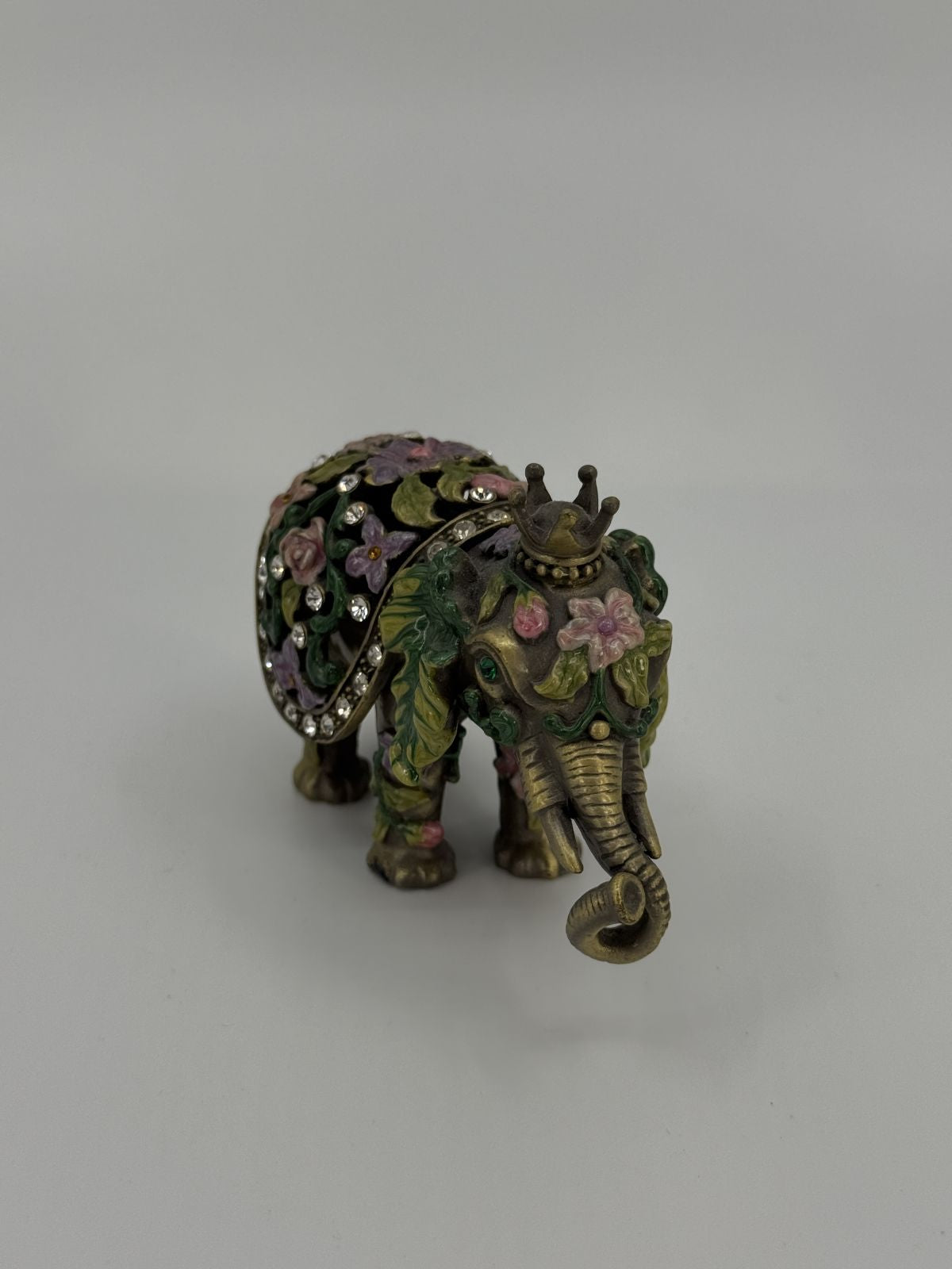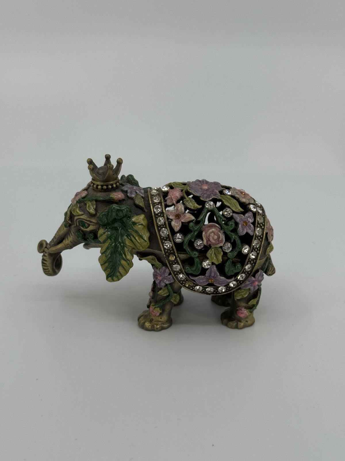 Dekoratiivne elevandi-kujuline ehtekarp, mis on kaunistatud lillede, lehtede ja sädelevate kivikestega. Karp avaneb selja pealt ning seest on lilla emailviimistlusega. Detailne ja efektne sisustuselement või praktiline hoiukoht väikestele ehetele.