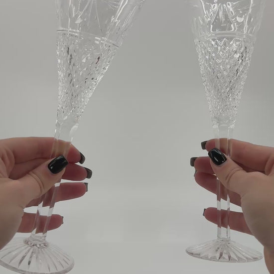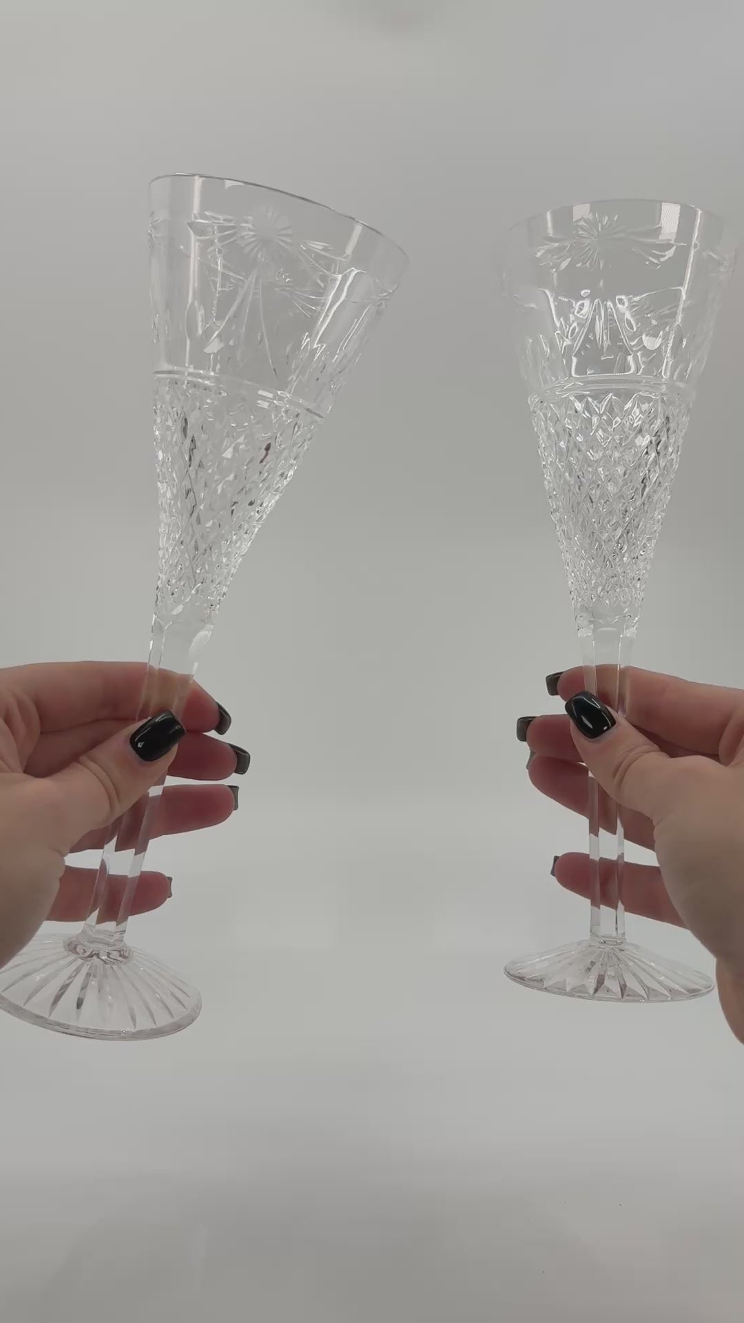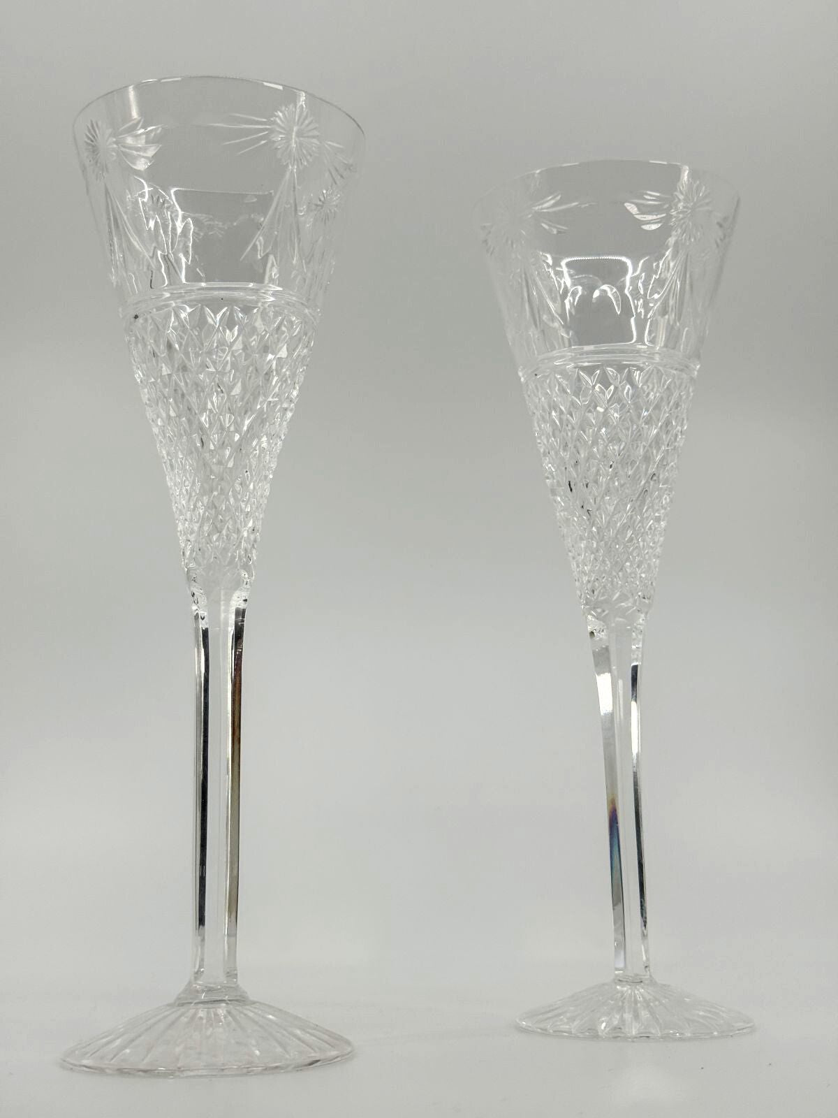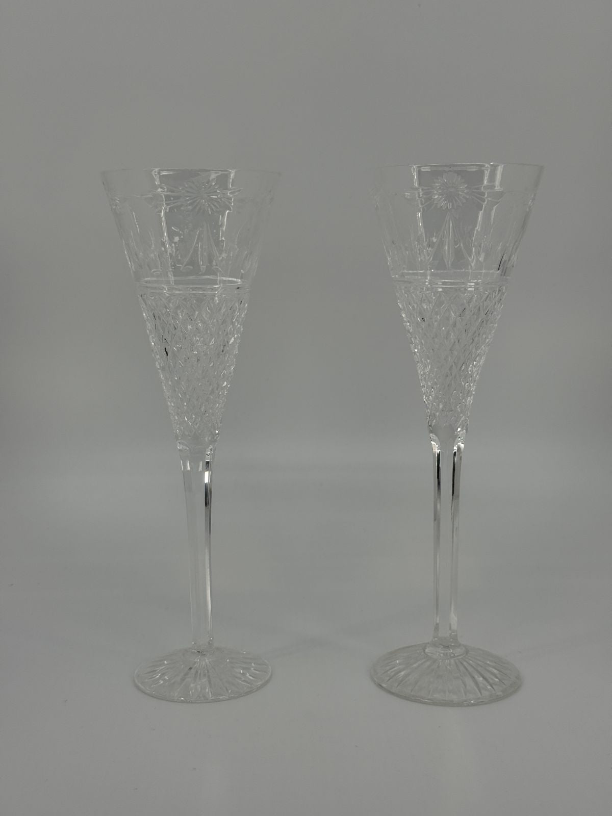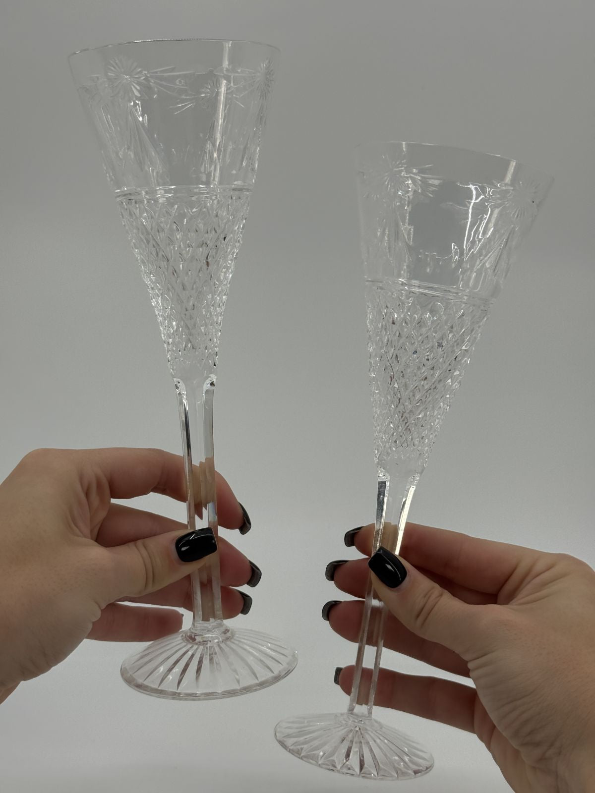 Kaunis lihvitud kristallist šampanjapokaalide komplekt kahele. Pokaalidel on elegantne kitsenev kuju, särav lihvitud muster alumises osas ja peenelt graveeritud tähemuster ülaosas.