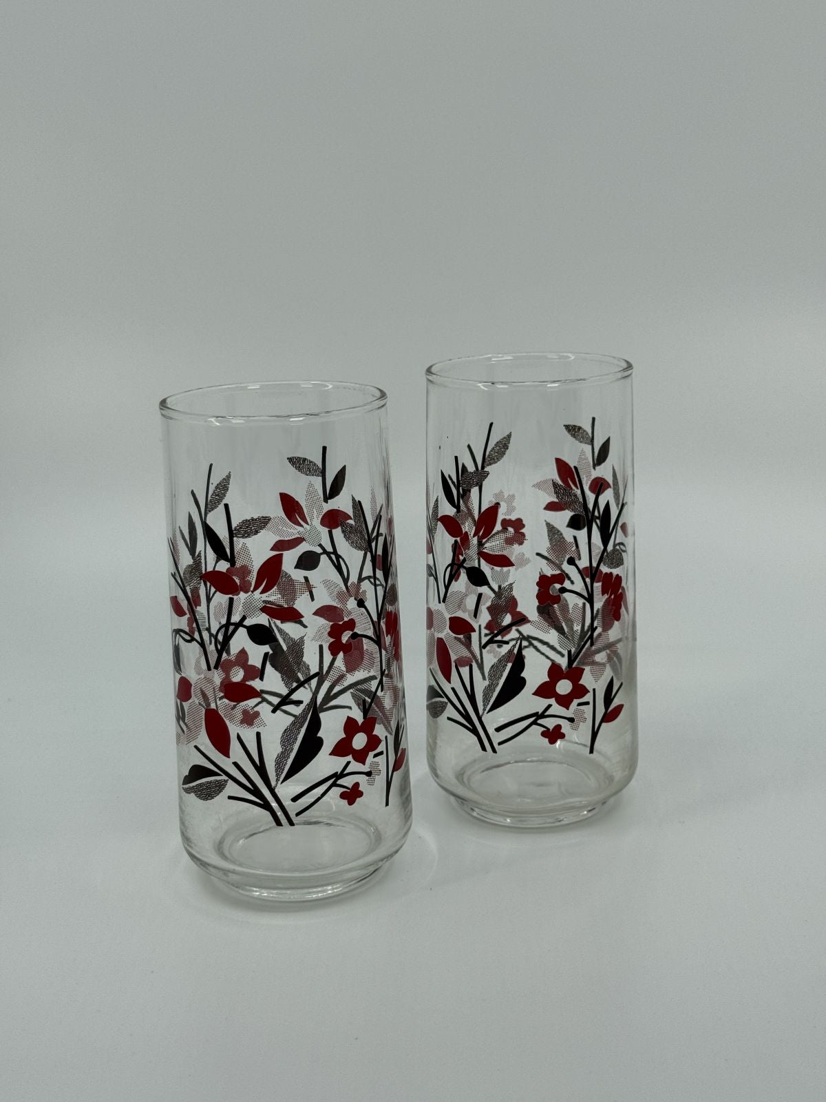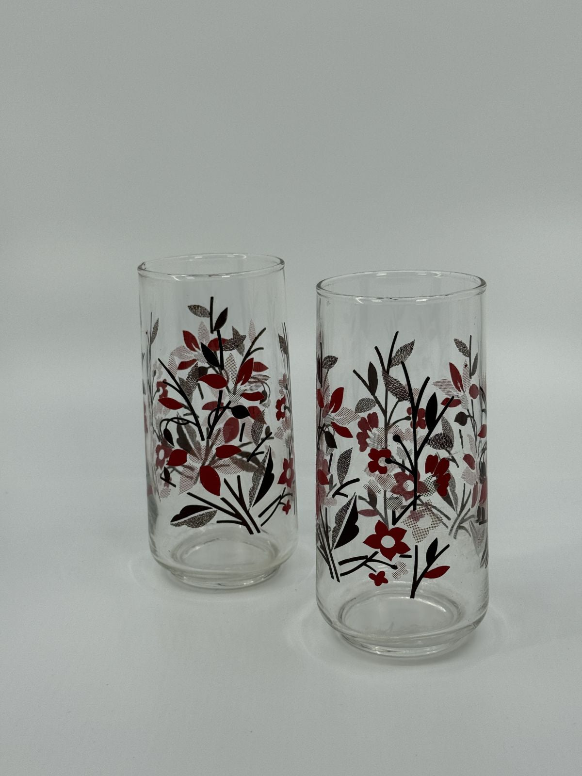 Kaunis vintage-stiilis joogiklaaside komplekt kahele. Klaase kaunistab punaste, mustade ja hõbedaste toonidega lilleline muster, mis muudab need silmapaistvaks nii igapäevasel kasutamisel kui ka pidulaual.