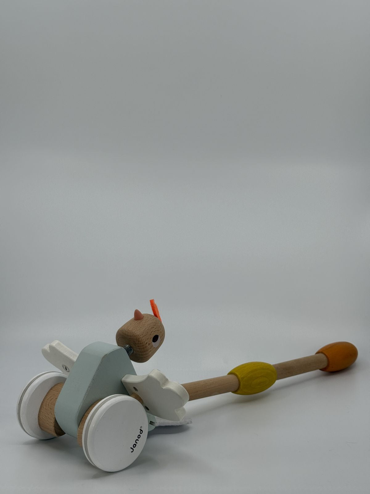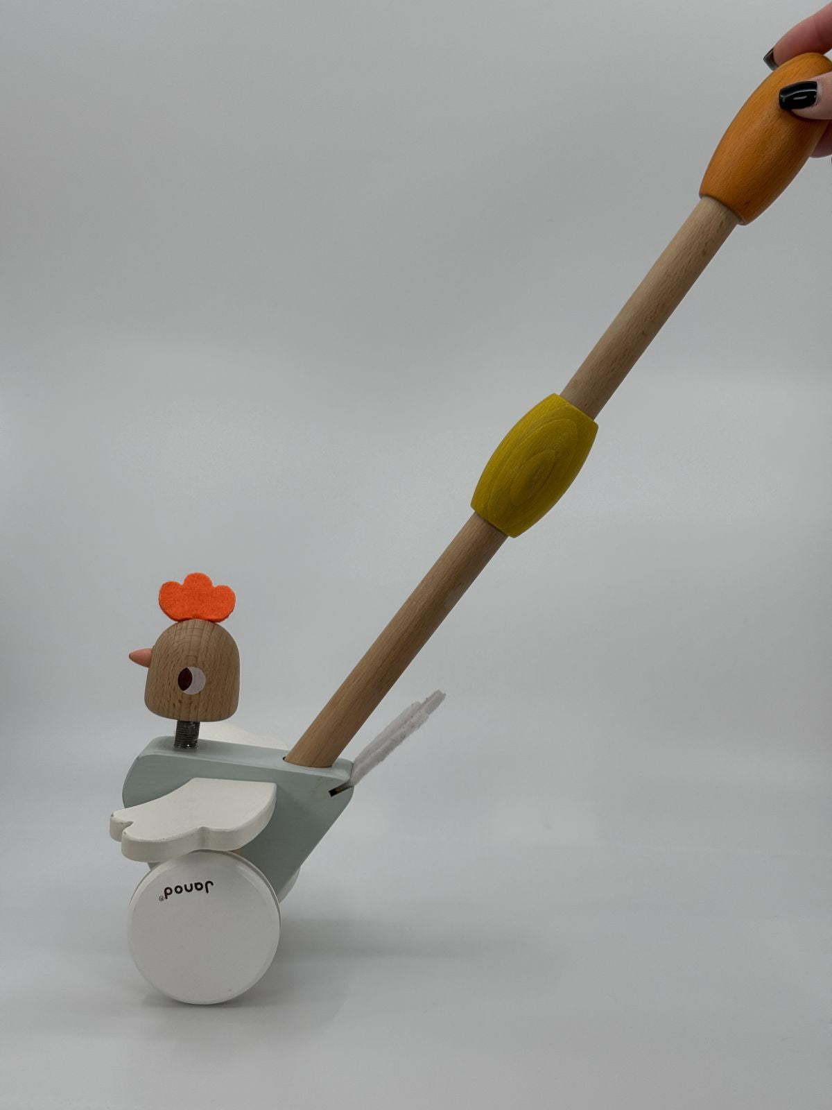 Lõbus puidust kana, mida laps saab pika varre abil enda ees tõugata. Kui kana veerema panna, hakkavad tiivad liikuma ja mäng muutub veel põnevamaks. Hele puit, valged rattad ja erkoranž hari loovad armsa ja mängulise ilme, mis sobib hästi nii tüdrukutele kui poistele.