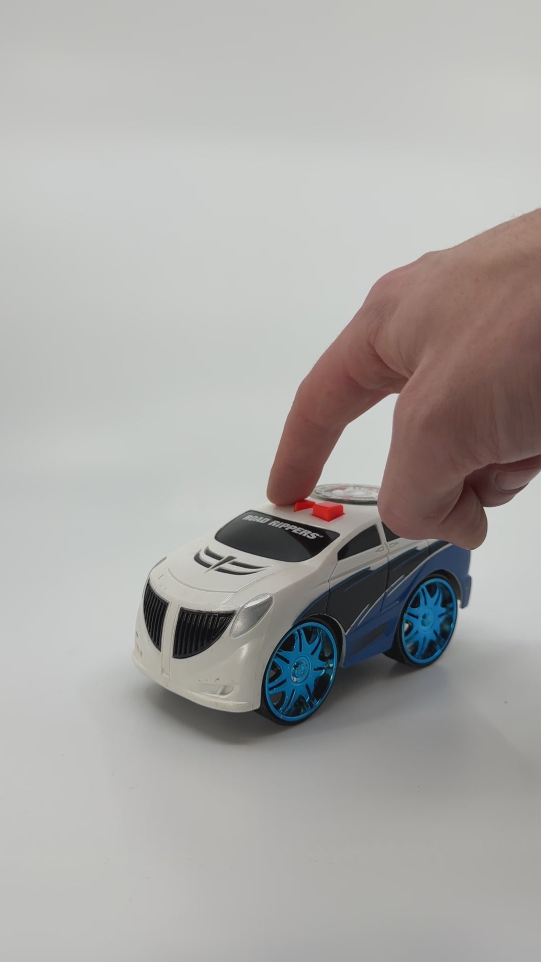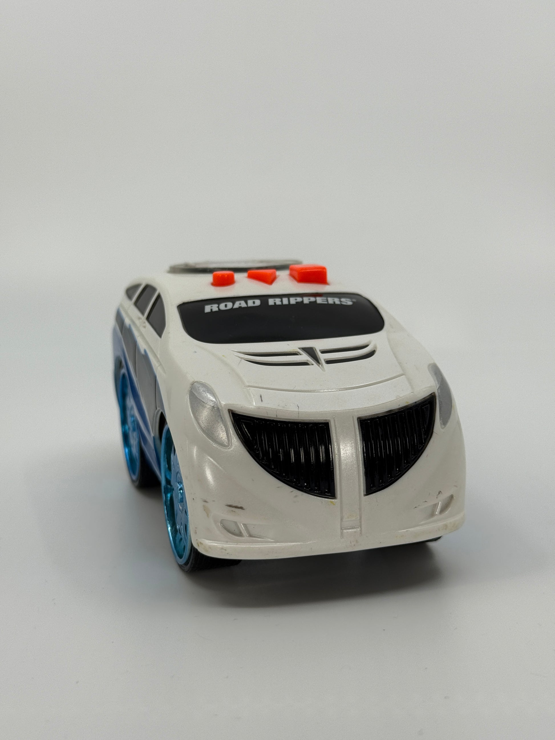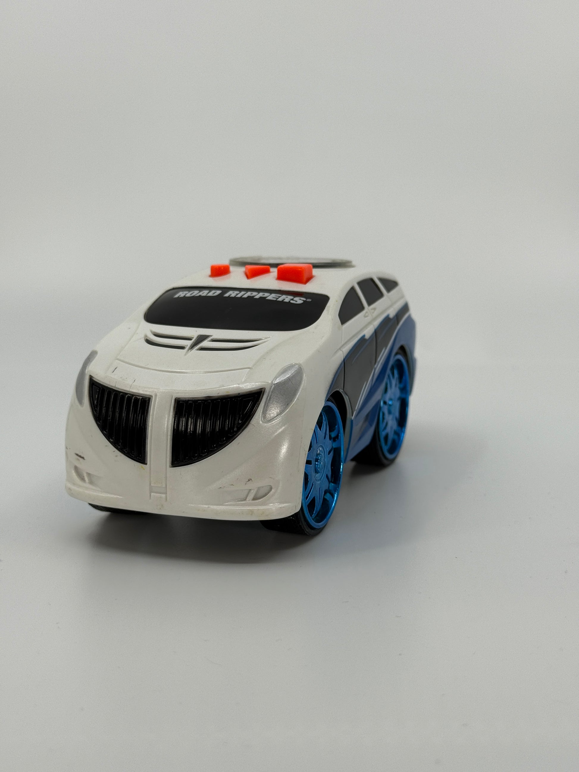 Valge Road Rippers mänguauto siniste velgede ja oranžide nuppudega katusel. Vajutades teeb helisid. Kerged kasutusjäljed, üldiselt heas seisukorras.