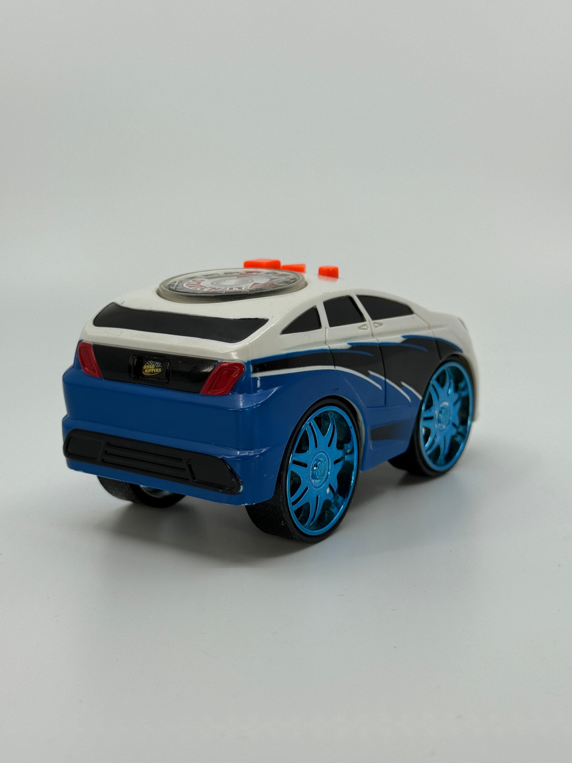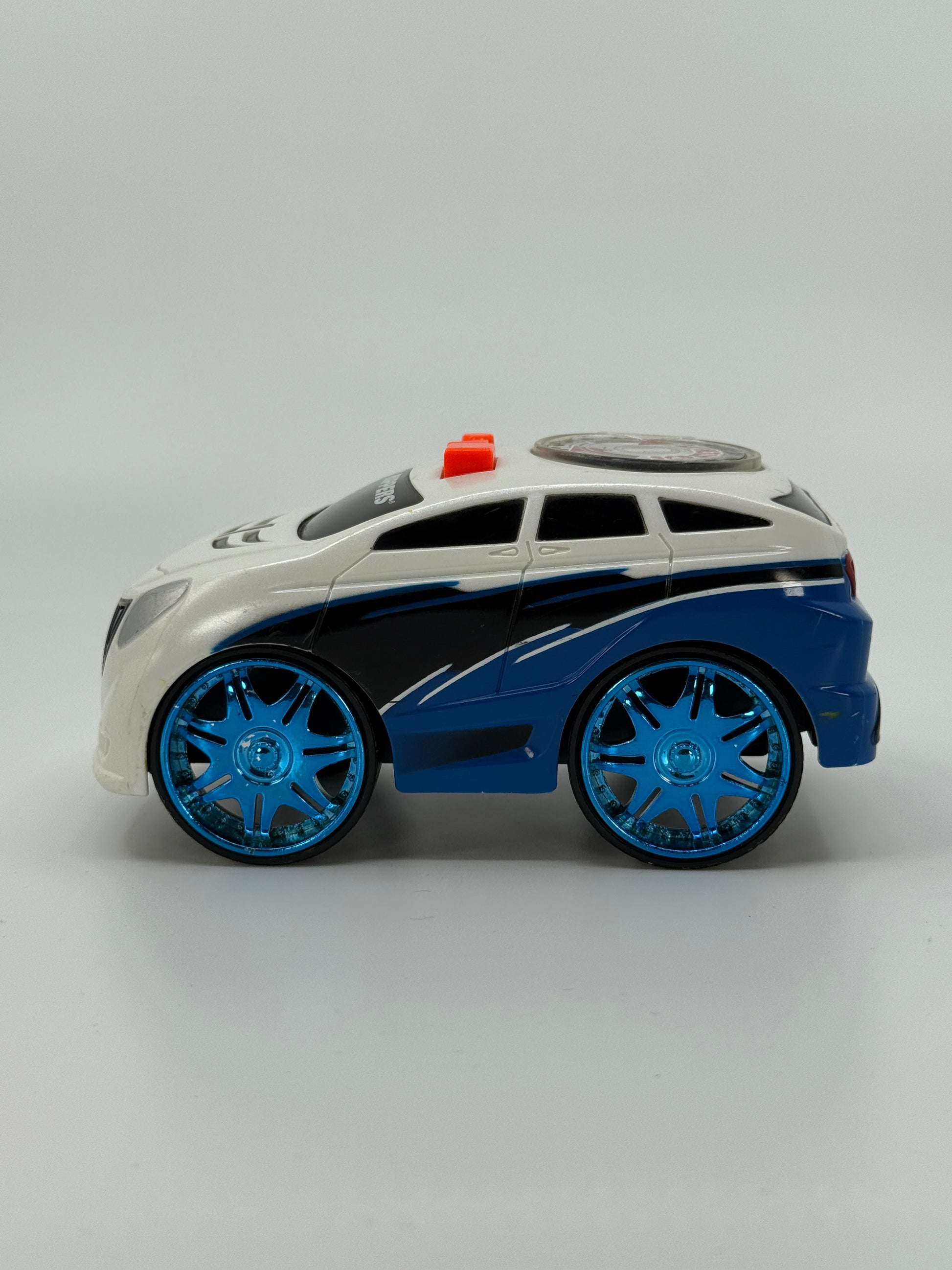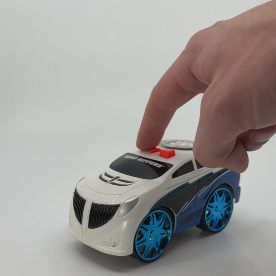 Valge Road Rippers mänguauto siniste velgede ja oranžide nuppudega katusel. Vajutades teeb helisid. Kerged kasutusjäljed, üldiselt heas seisukorras.
