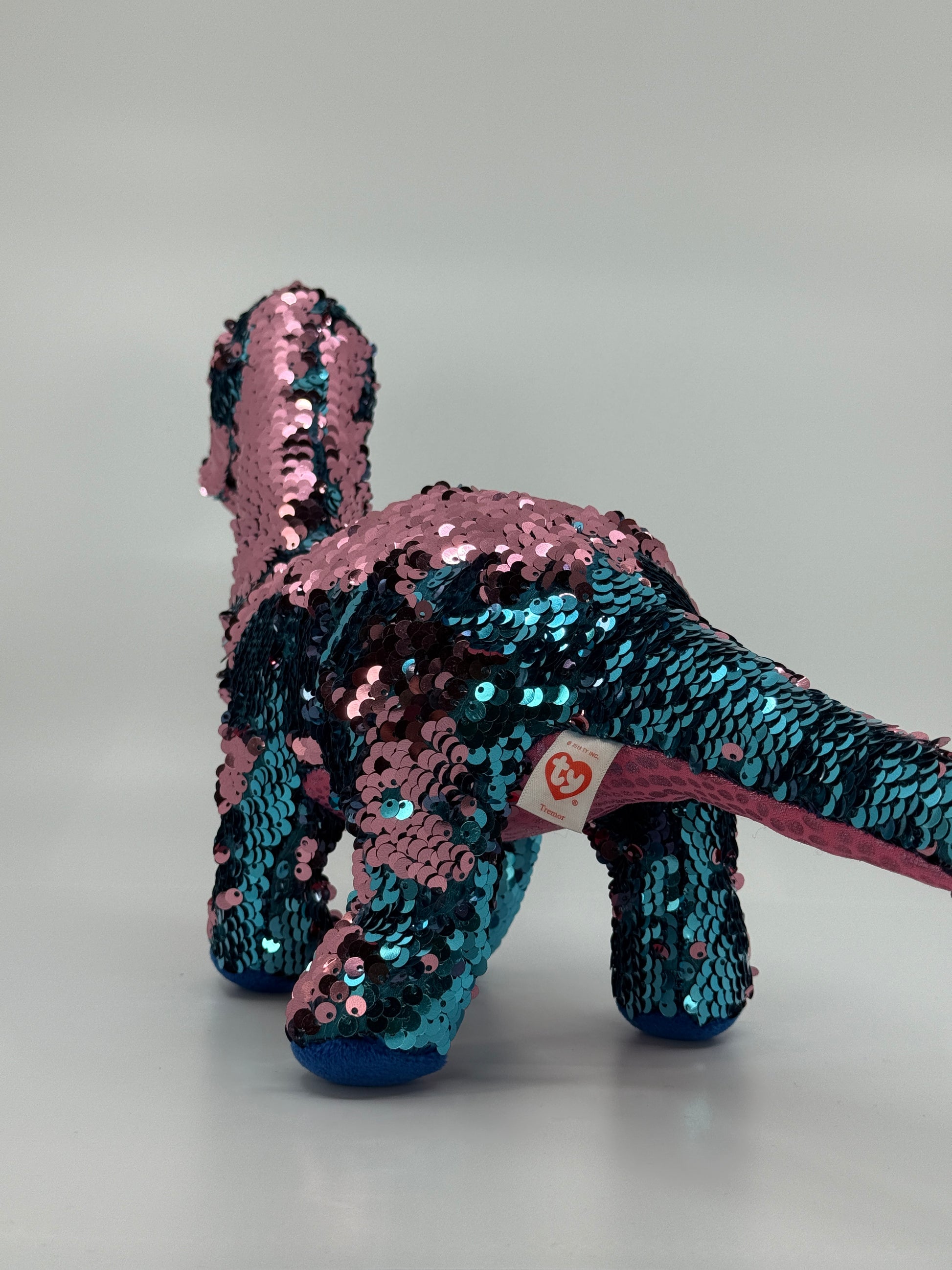 Sinise ja roosa litritega kaetud pehme dinosaurus. Litreid saab käega silitades värvi muuta.