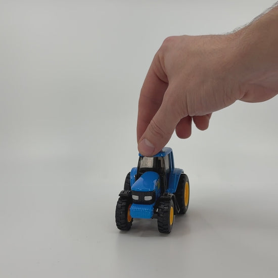 Klassikaline sinine mängutraktor kollaste ratastega. Sõidab tagasi tõmmates edasi.