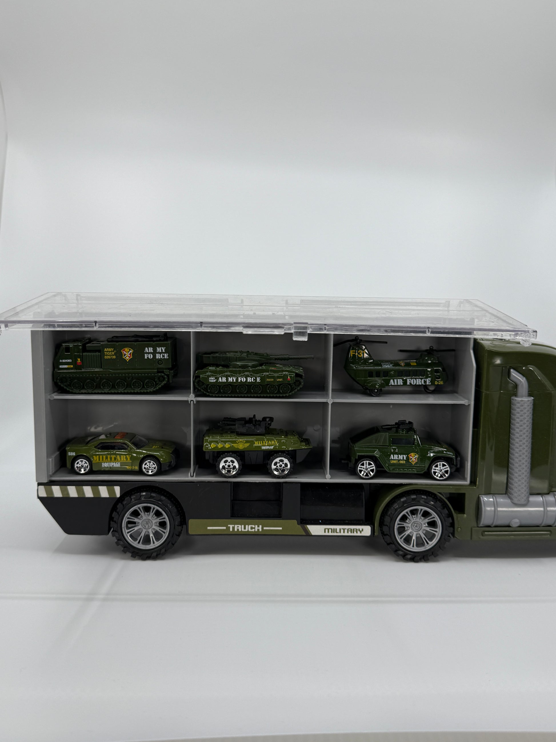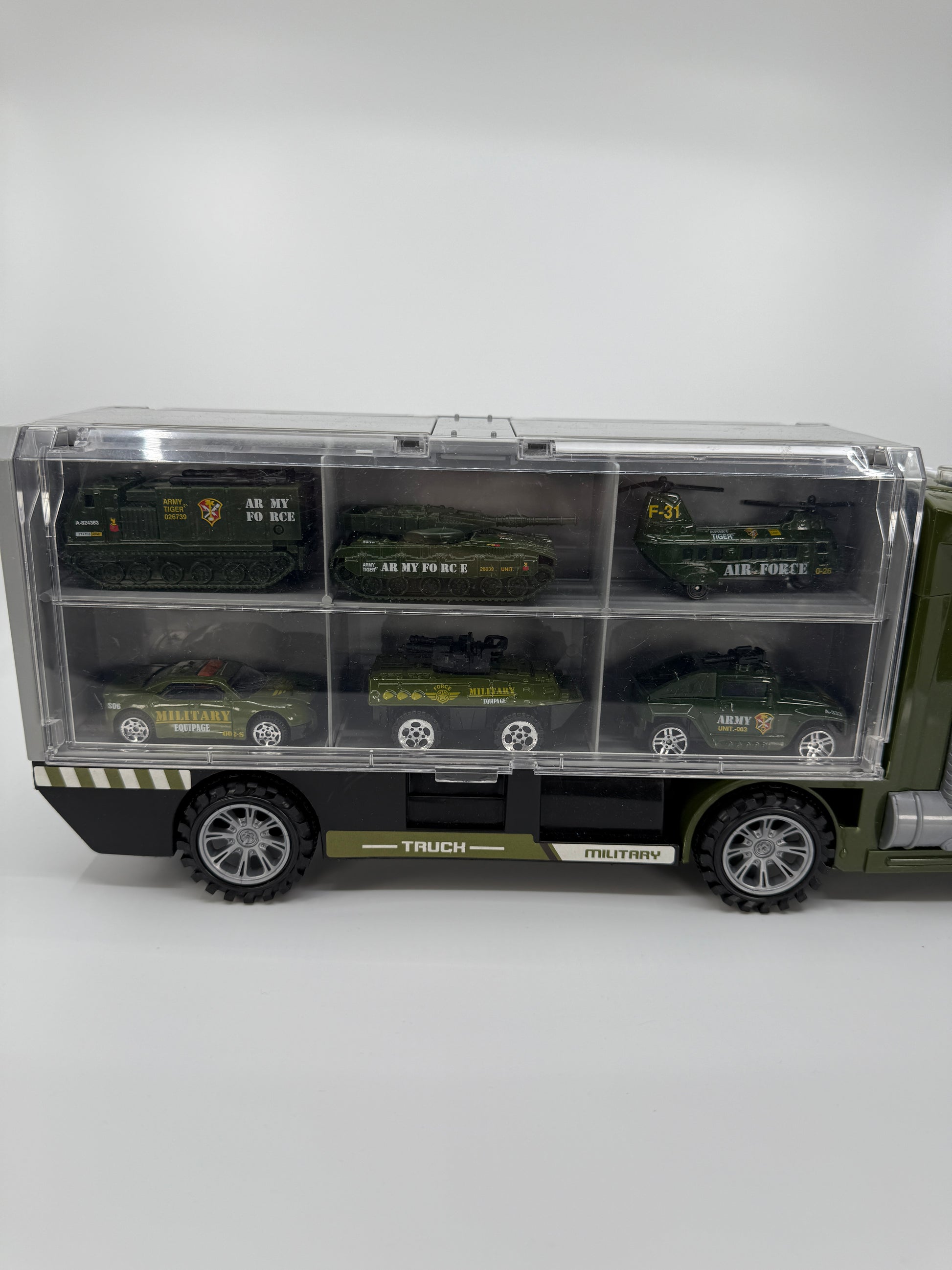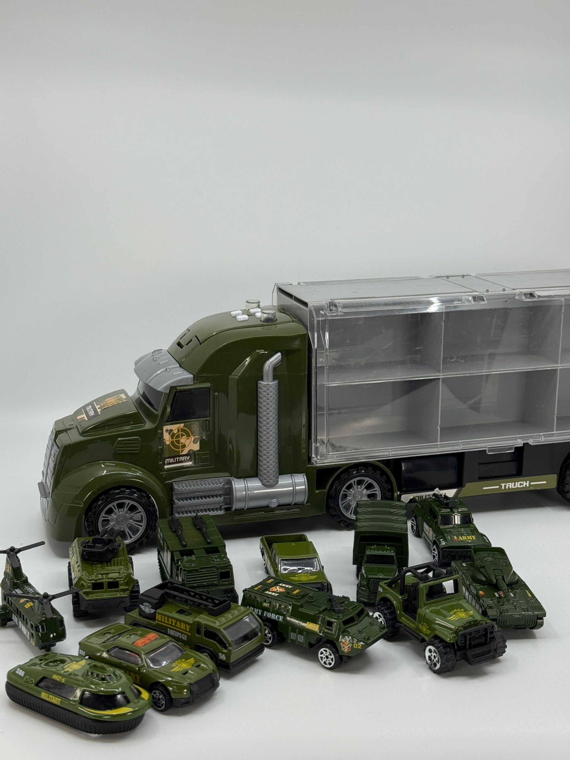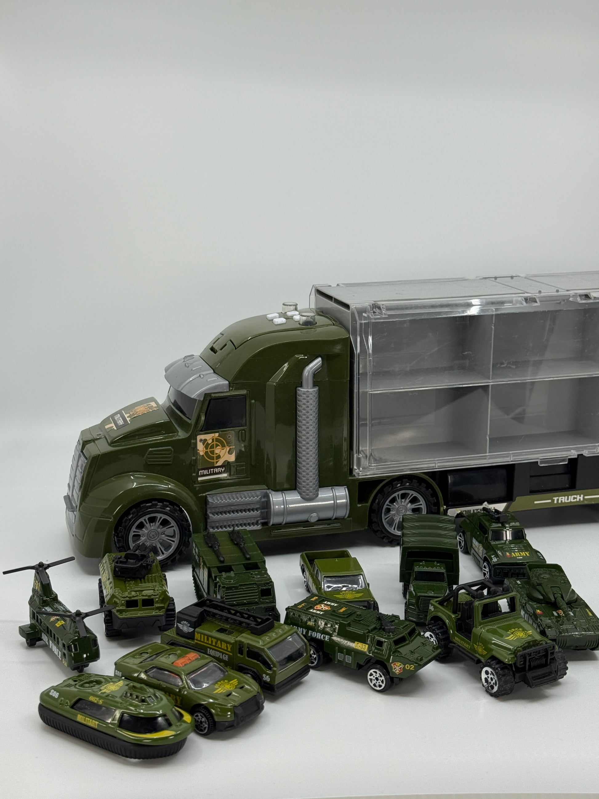 Suur sõjaväe teemaline mängukomplekt, kuhu kuulub roheline veok ja 12 väikest autot. Teeb erinevaid hääli.