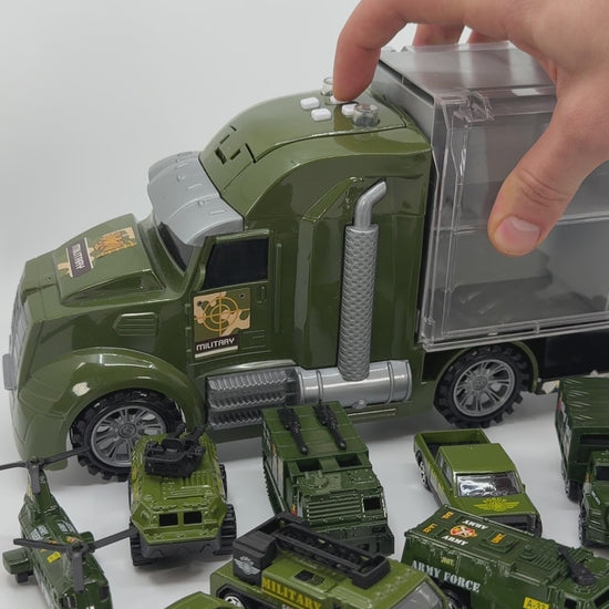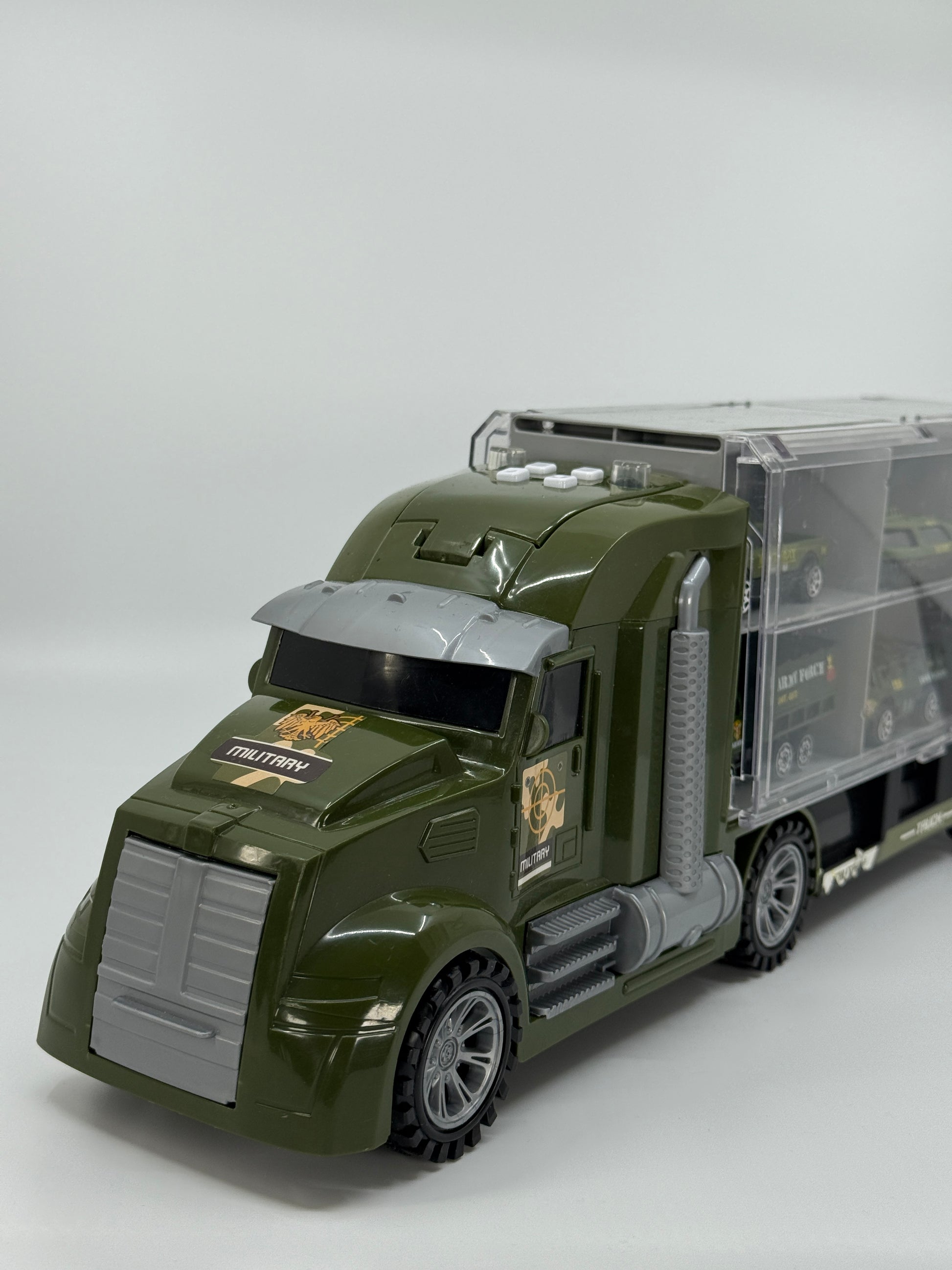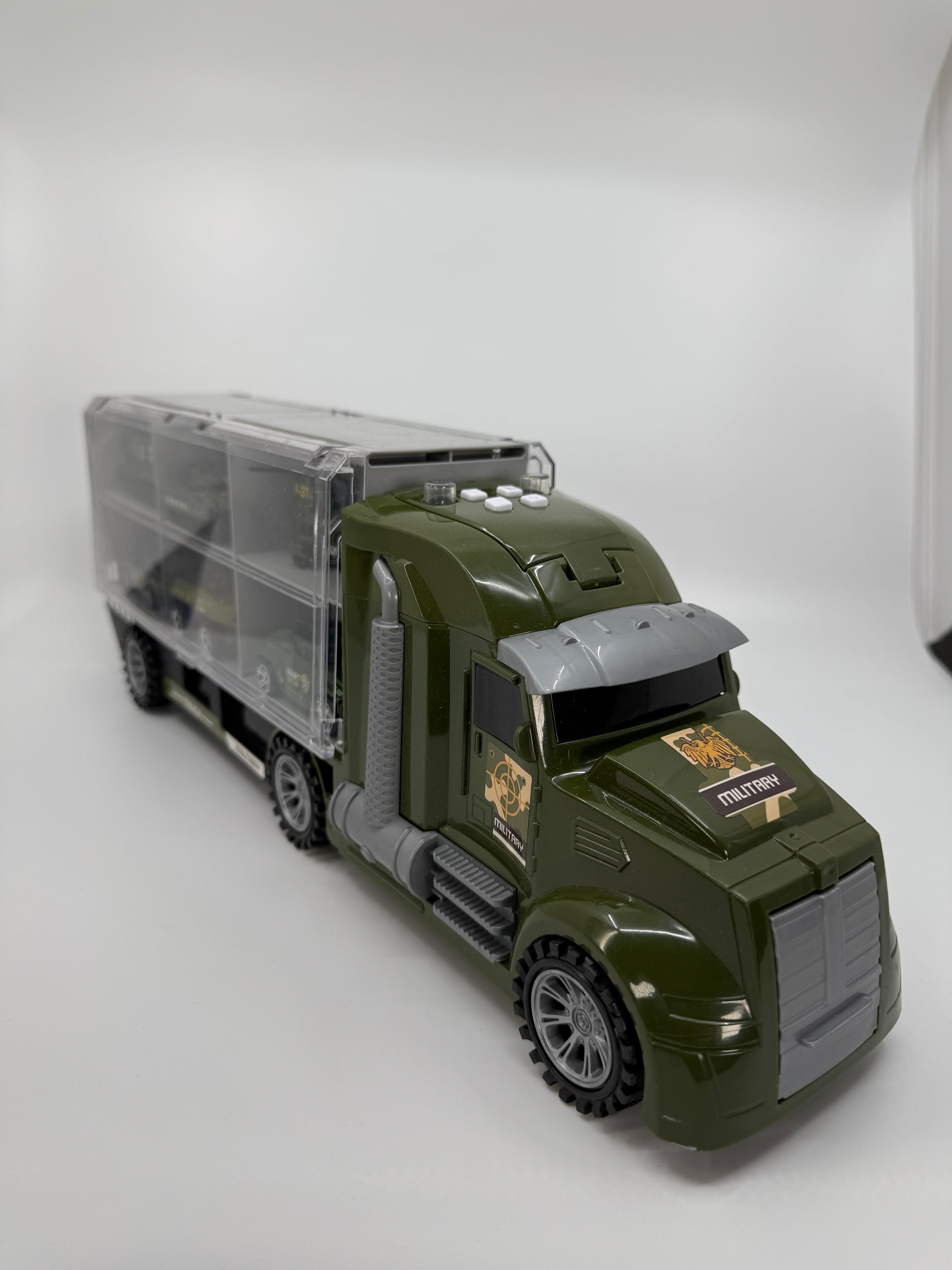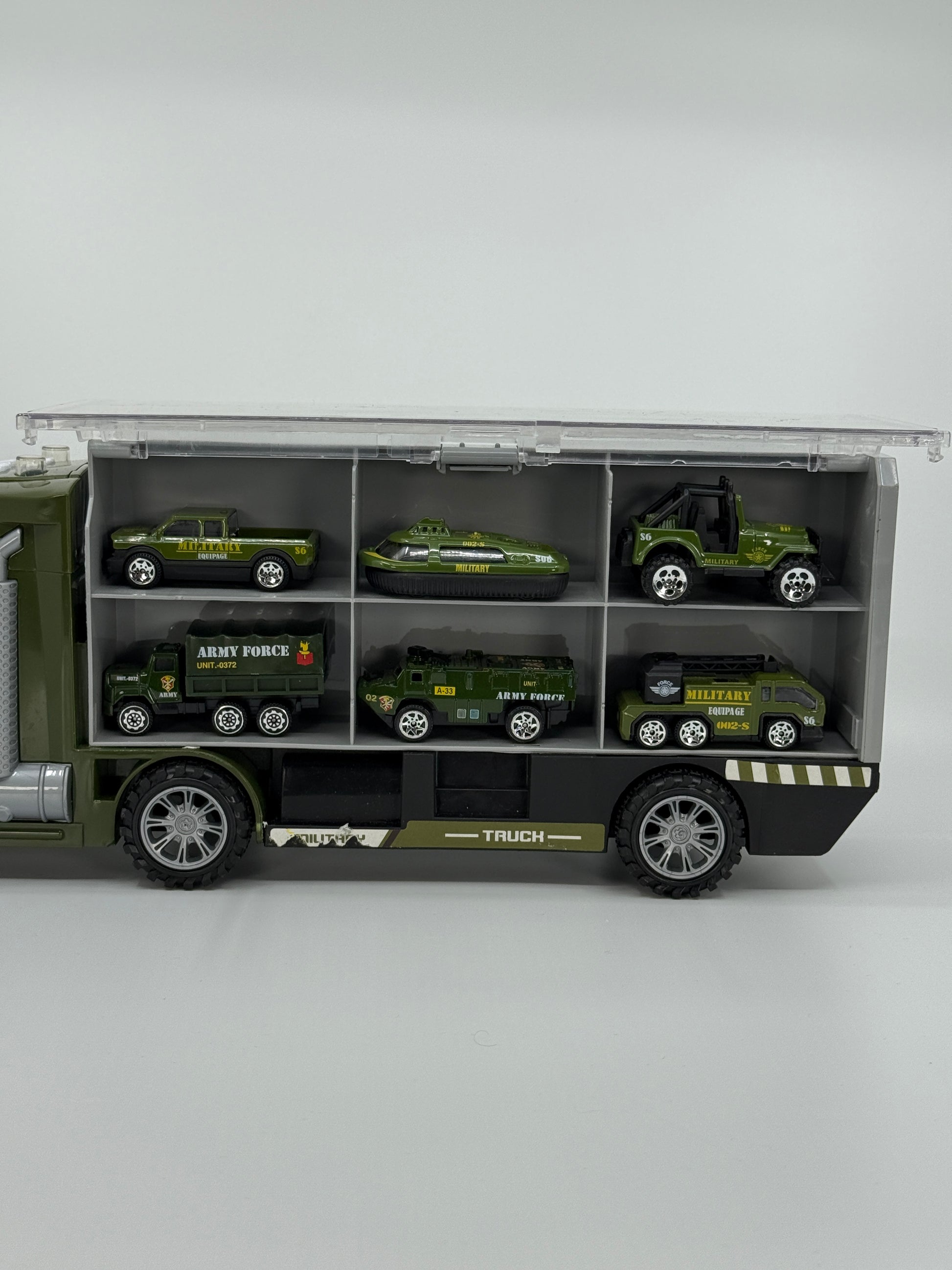 Suur sõjaväe teemaline mängukomplekt, kuhu kuulub roheline veok ja 12 väikest autot. Teeb erinevaid hääli.
