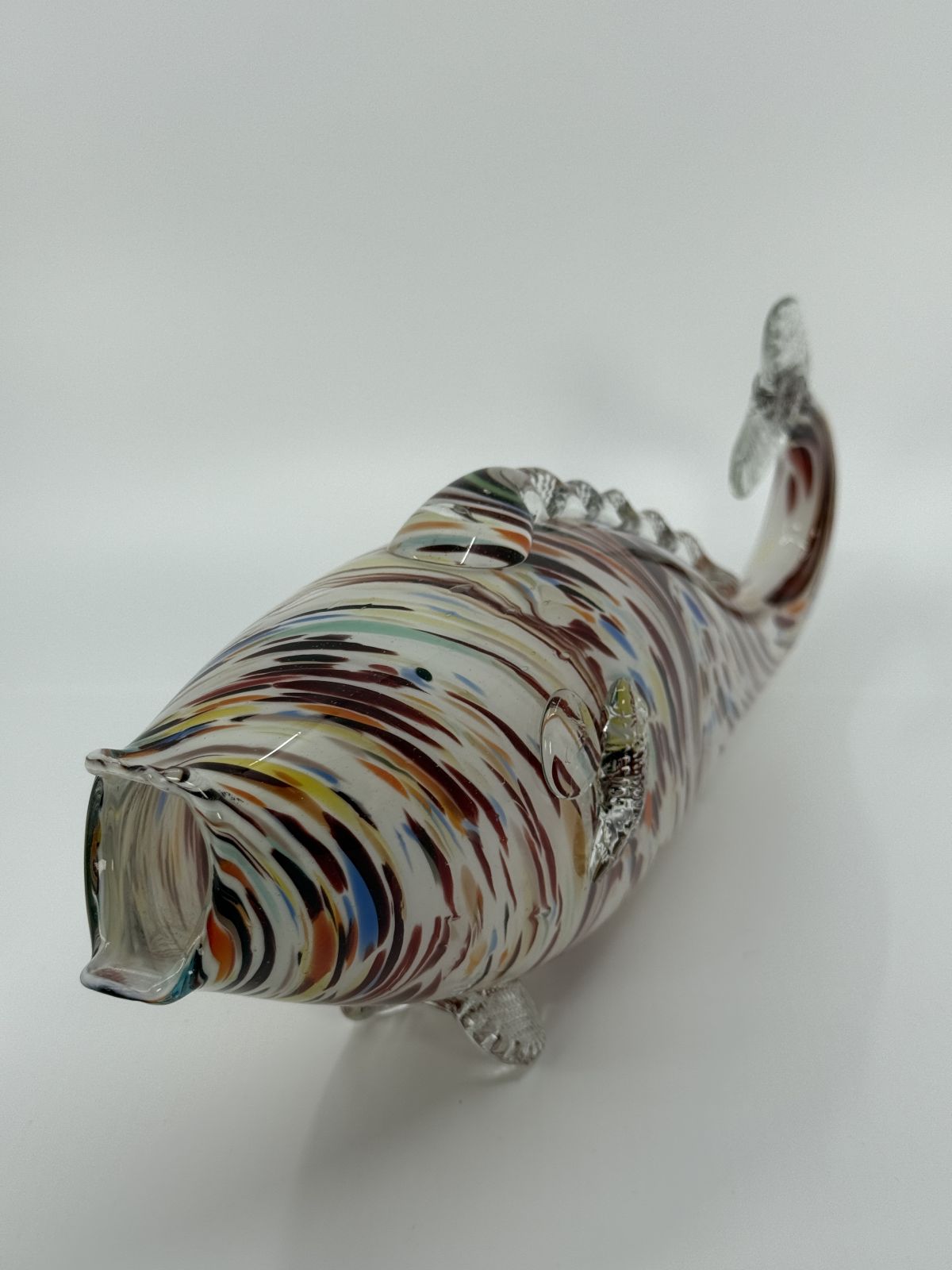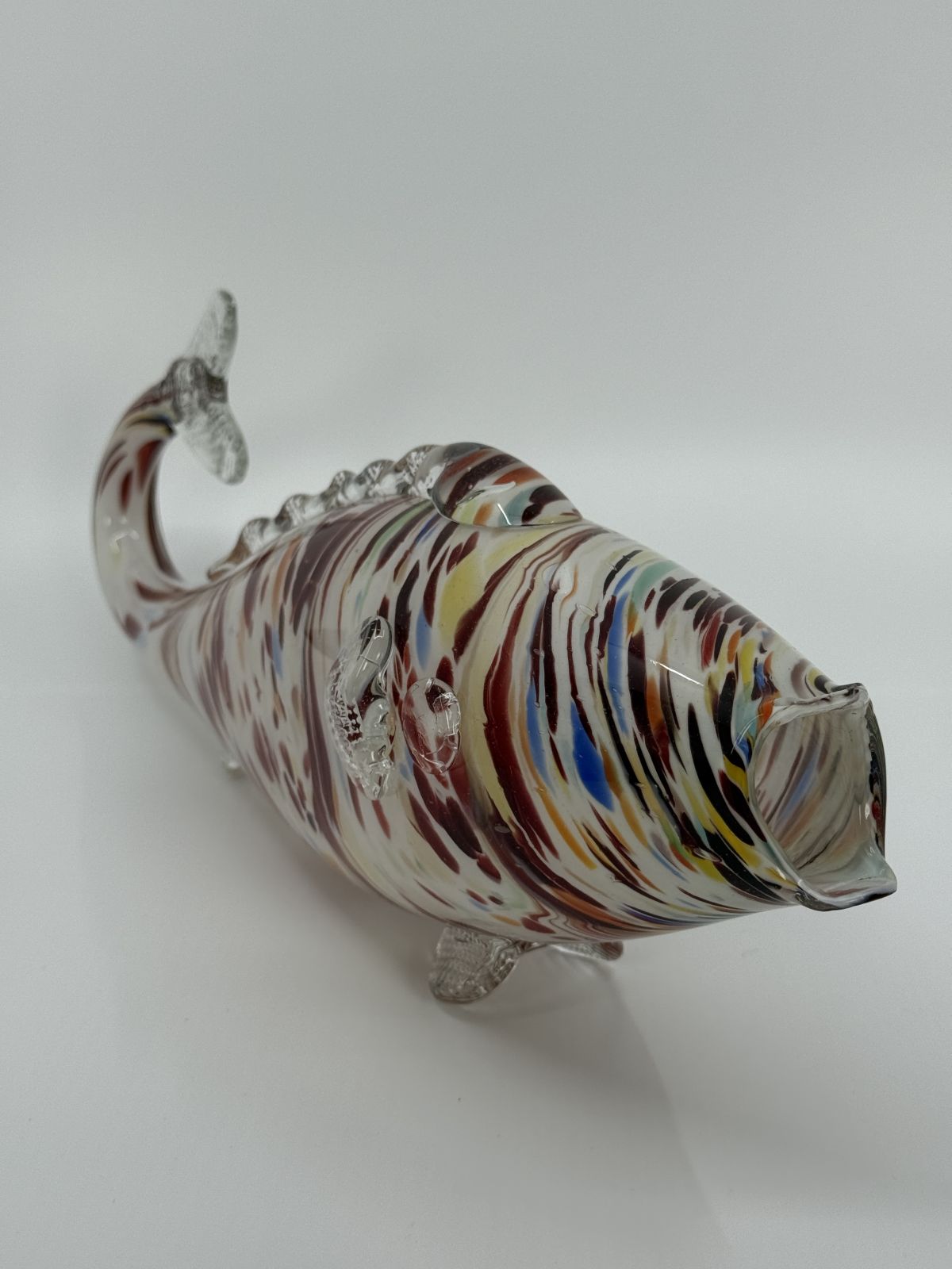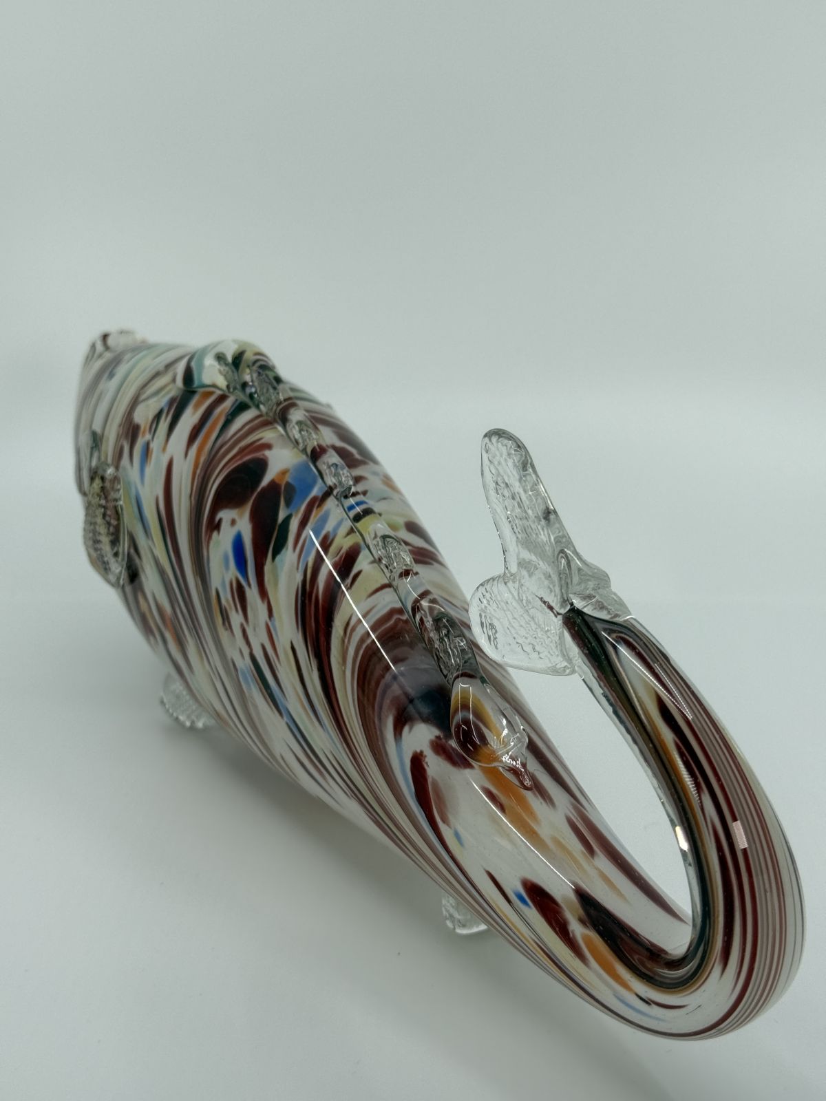 Unikaalne käsitsi valmistatud klaasist kalafiguur, millel on värvikirev ja voogav muster. Skulptuuri keha katavad maalilised pruunid, sinised, kollased ja valged toonid, mis loovad kauni merelise efekti. Läbipaistvad uimed ja saba lisavad delikaatset detaili ning muudavad kuju visuaalselt kergeks.