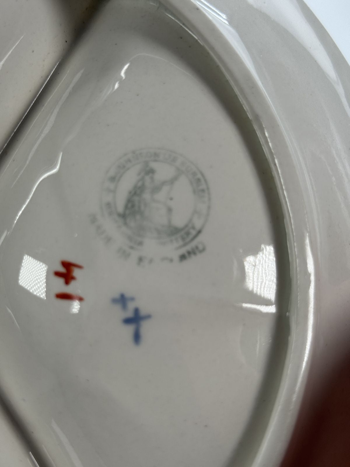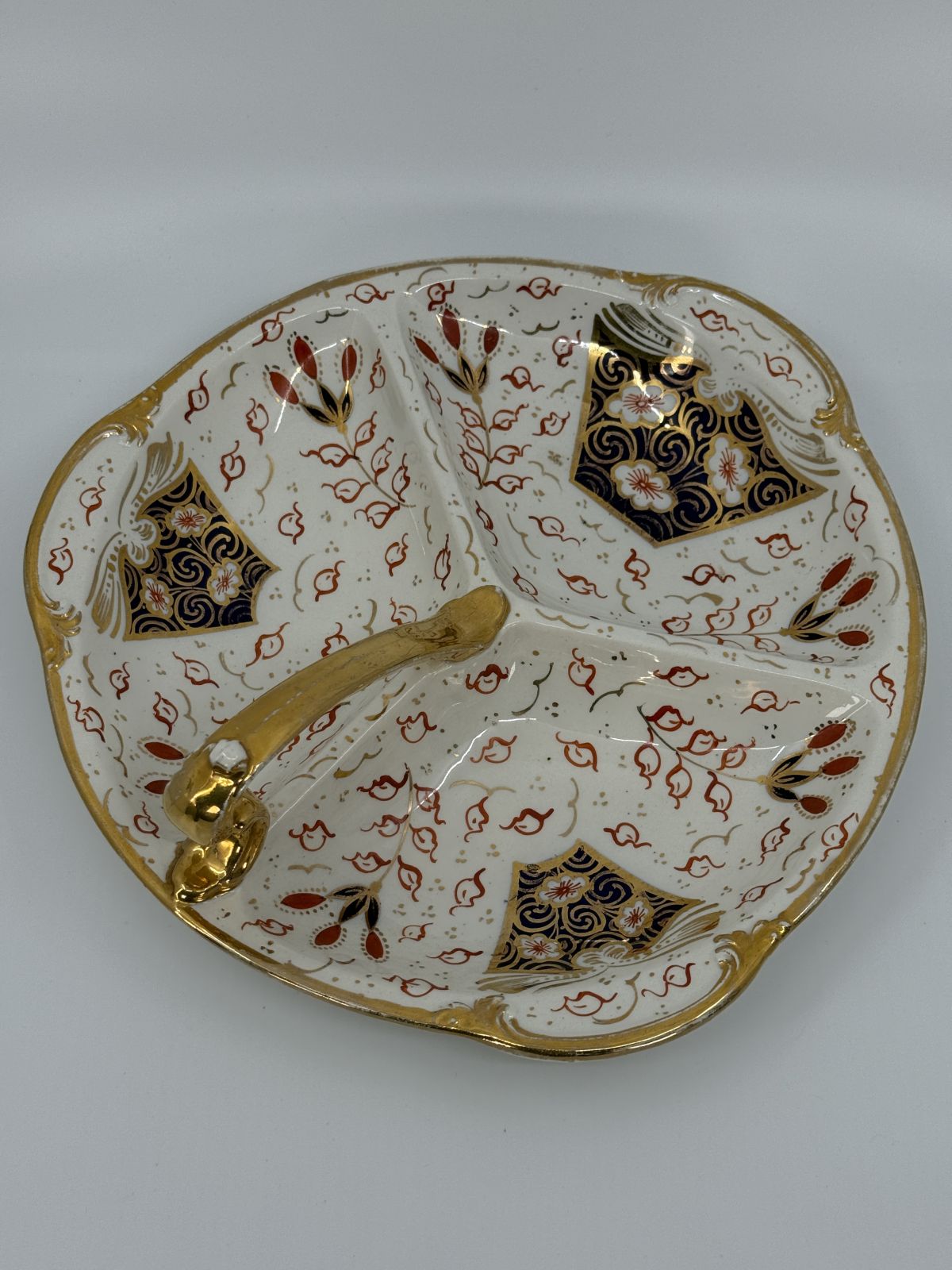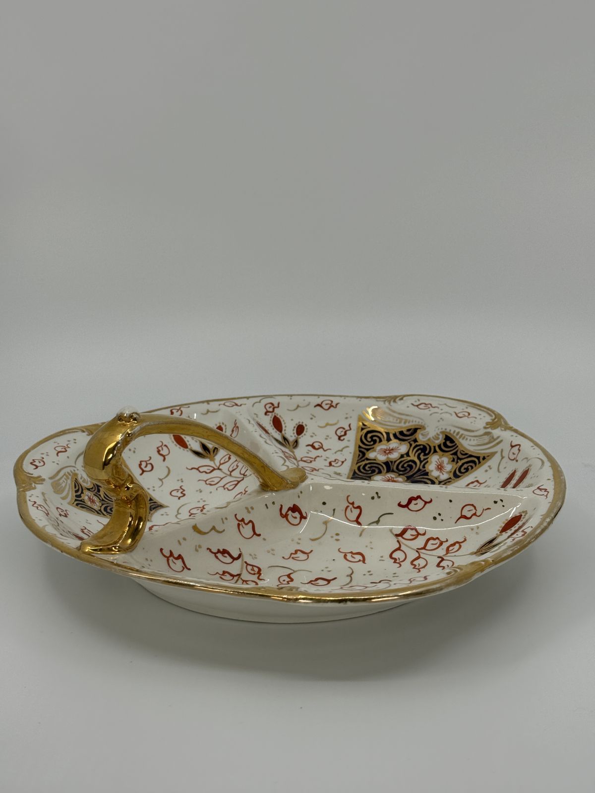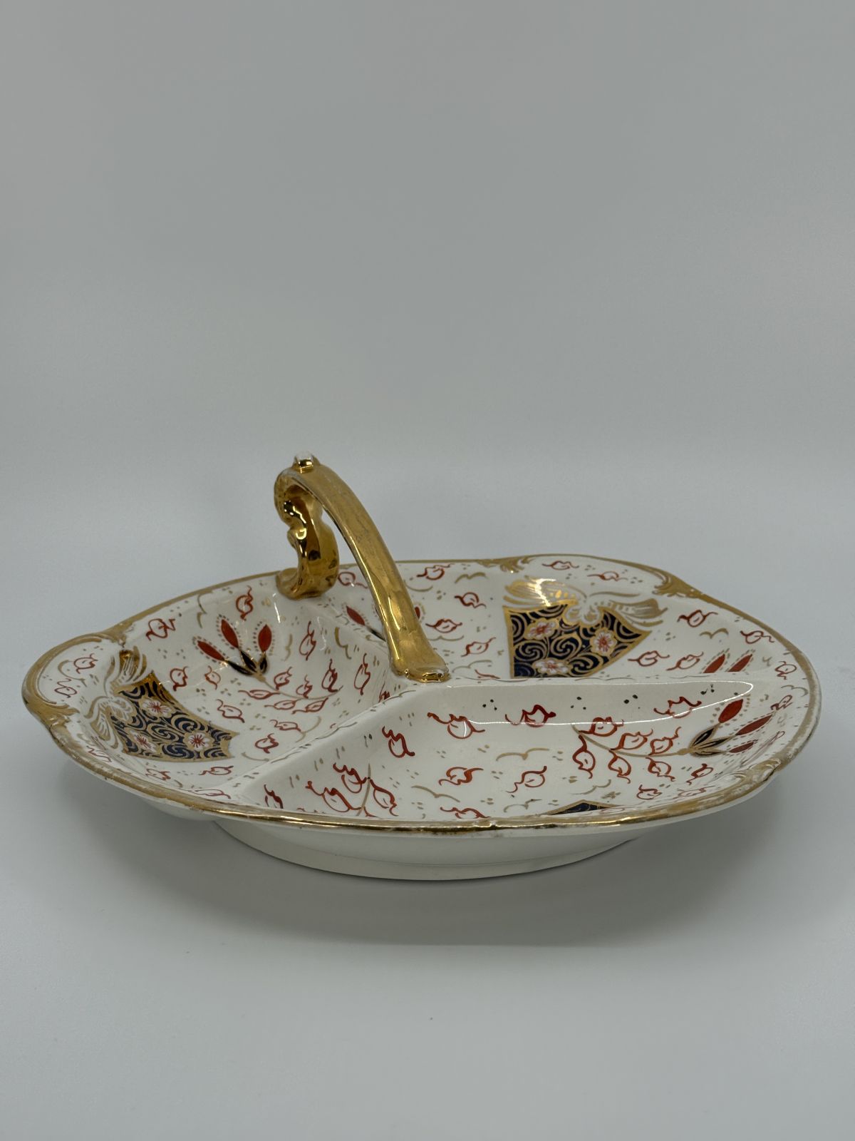 Elegantne Staffordshire’i stiilis vintage serveerimisvaagen, kauni kuldse käepideme ja käsitsi maalitud mustriga. Kolmeks jaotatud kujuga, sobib suurepäraselt maiustuste, pähklite või suupistete serveerimiseks. Keraamiline vaagen on rikkalike punaste, siniste ja kuldsete detailidega, lisades igale peolauale luksuslikku ja klassikalist inglispärast hõngu.